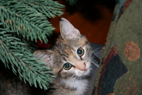 I had posted about my three putty-cats earlier...but we have added a new fur-kid recently. Just before Christmas, we decided that we needed to do a good samaritan ride to the shelters from which we had gotten our other cats to deliver food and other goodies. Low and behold, there was one tiny kitten who stole our hearts and our family of 4 became a family of 5. Me, the DH, Elwood, Jake, Tortuga and Cuchulainn (pronounced Coo-Hool-lin or Cuey for short). Here she is...