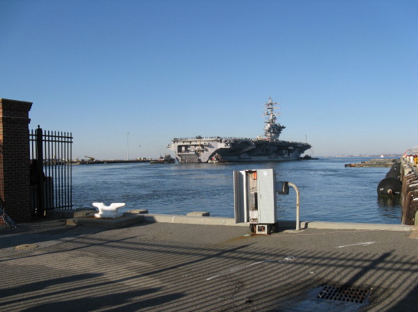 Thanks for all of the thoughts and prayers. He will be there for 6 months, back in the US for 6, then deployed again. When they left the dock, (in Norfolk, VA) they had a band play the Star Spangled Banner and they lined the flight deck. Blew the whistle and took off waving to everyone on the dock. You can't see the crowd because I held my camera through the gate. Lots of cheers and tears! It was an amazing sight.