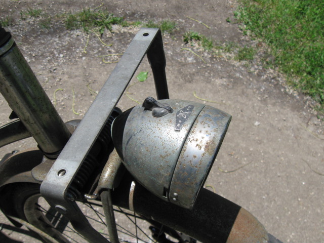 Check out the dual action kickstand and the plastic cover (could it be bakelite?) on the crank. The sticker on the rusty back fender is for a bike safety club headed by Richard B. Ogilvie, governor of Illinois from 1969 to 1973.
