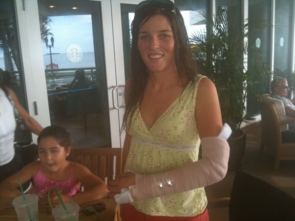 Damn girl, glad you're okay! You look like me after my last horse wreck. The worst thing about a broken elbow is straightening it when the cast comes off. You'll walk around for a while with a permanent bend. That head wound is a real mystery, I wonder if the chainring penetrated your helmet somehow? OUCH!