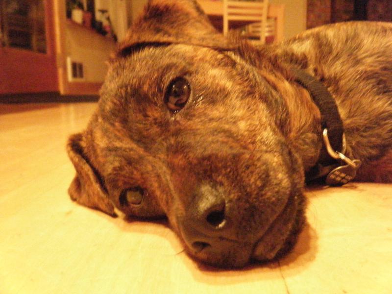 He looks like a mini brindle lab except that he has long legs and a very narrow waist. He's tiny, only 25 lbs. My last dog was 130 lbs.![]()