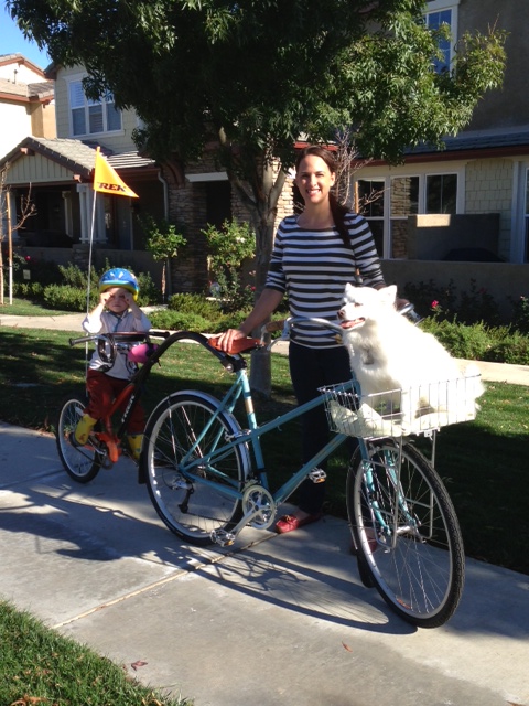 I got her all set up finally! I think it will all be worth it! On the back is my 4 year old. My older one is in school and my little guy goes everywhere with me. He's a great companion. My other companion is an 8 year old American Eskimo Dog - Dayton Dogg, as he's known around these parts! Nobody worry, we are abiding by the weight restrictions on the rack