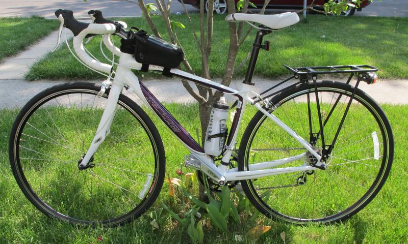 This is my road bike that I bought last may a 2011 Specialized Dolce Sport Compact that I ride on group rides that meet twice a week. I now have a REI Novara trunk on the rack that is loaded with all kinds of stuff, including an emergency kit, tools, extra tire tubes, rain jacket. Just last week a guy went over his bike and sliced a finger wide open. I was able to stop the bleeding & patch him up so he could continue with the ride..