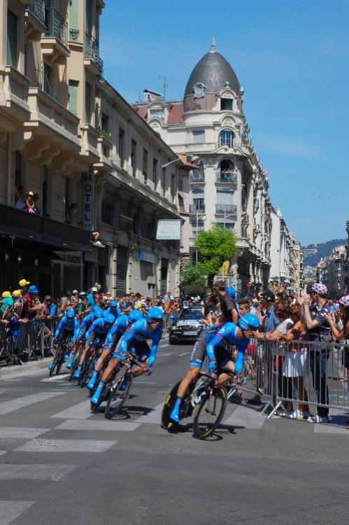 I grew up on a 1970s steel Japanese road bike (with drops) that had been my mother's, but that she didn't ride any more. Dreamt of one day seeing the Tour de France, in France... "just once," I thought, "would be so awesome!" Came to Europe about 15 years ago, without the bike... wasn't able to get my own until seven years ago, the GT, when I had the chance to do rides on forest trails near our offices. That was great, then my company sent me to a city closer to where I live a couple months ago, and my teenage dream of getting a nicer road bike came roaring back! The trusted bike shop recommended the BH to me, and it was love at first ride. Ever since I got it I've been just giddy, it's a sweet bike. And in the meanwhile, I've seen the TdF so many times now that I've lost counteight or nine stages over the years?! maybe ten? It went through Nice again this year! It was a beautiful day (pic I took):
