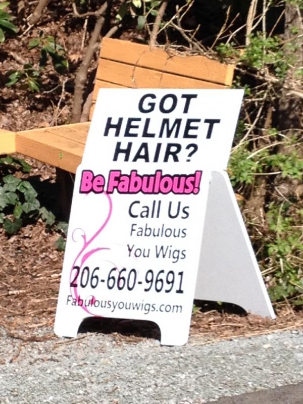 Thinking: Gee, my hair's gotten so sweaty and matted on this ride! Obvious solution : Golly, slap on a wig!? Whaaa?