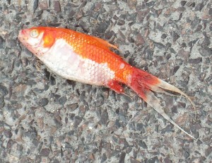 My guess is that fish was swiped from a backyard pond by a bird who couldn't hold on to it.