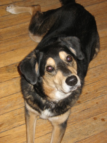 Maggie is 8 months old (born in the shelter) and Charlie is about a year old. We have been told that Charlie is a yellow lab/basset hound mix. We think Maggie is a mixed bag of dogs...but we call her our MonkeyPigFish as she loves bananas, eats like mad and plays in mud, and she is crazy about all water. Charlie loves our cat, Kitty (yeah, I know...real original) and they play all the time.