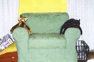 The black boy is Jake. Yes, named after the Blues Brothers. Jake is a bit of a loony, unfortunately, and now has to live apart from his big brother Elwood. They take turns spending part of the day enjoying the atmosphere of the basement!!! They haven't gotten along since we introduced our little girl, Tuga. She is the CUTEST thing in the world, even though she came between the boys!