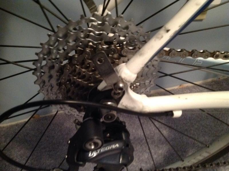 The Specialized Amira Sport I bought back in July came with a 50/34 compact double and a 12-28 cassette. I ended up doing the paperboy switchbacking (traversing) on the steeper 14%+ stuff, so I bought a 11-34 cassette, a Shimano Deore XT 9-speed MTB derailleur, and a SRAM 10-speed chain. The bike is 10-speed, but there are no current model Shimano 10-speed MTB derailleurs that will work with Shimano 10-speed road groupsets (this bike came with Shimano 105).