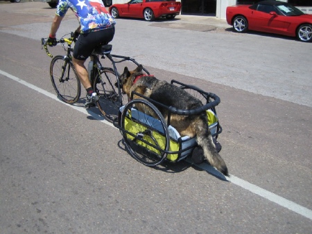 This is from the MS150 2004. This dog couldn't have been light! I heard he was whimpering by the end of the ride. Probably was a bit too long in the trailer for him. I think someone mentioned seeing this dog again this year.
