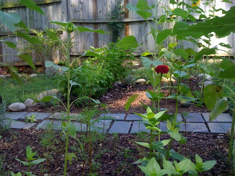 I created several new beds this summer. The herb half-moon bed will be fabulous next year, when the lavender and rosemary fill in the border and I get additional herbs in. Right now there's alot of basil, zinnias, and cosmos to fill in.