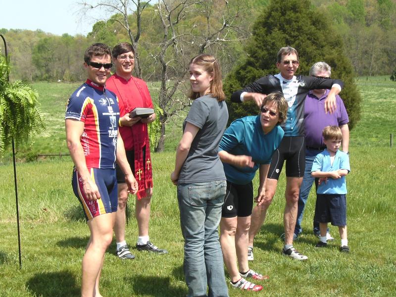 So, L to R in the first photo are DS, the minister who happens to be a cycling buddy of ours, non-cycling DD, me - leaning over to see if the late arrivals are headed our way, DH (I have NO IDEA why he is flapping! ), DH's brother (behind his elbow) & the ring bearer, who carried the rings in his jersey pocket all the way.