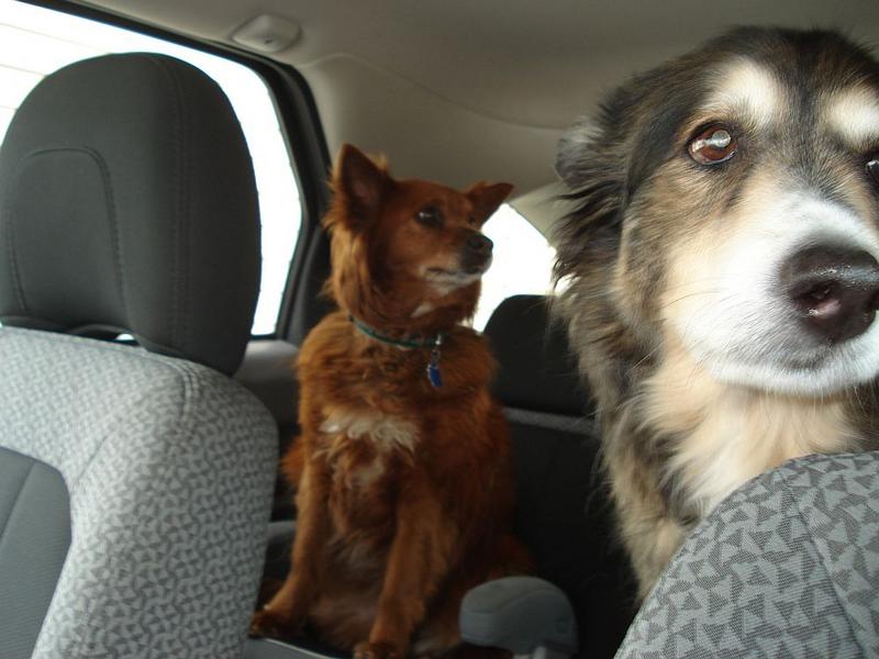 Here's a couple "before" pix. The first is him and Zeus checking each other out in the backyard. The second is in the are on the way to the groomers. Notice he's sitting in B's carseat!