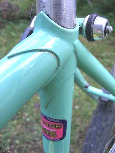 Here are mine. My frame is Columbus SL double-butted, a model called the Blue Ridge sold by Performance in 1983 or so. First the seat lug. Notice the little Columbus symbol on the seatstay. Then the headlugs, and the large Columbus symbol on the fork crown and sticker further down. You can also see the Campy Record shifters and the new Chorus headset and the cableguides (like Mimi cut off of her son's bike). Third pic is the bottom bracket lug, and the Suntour Superbe Pro crankset with nekkid crank bolt.