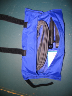 Necessity being the mother of invention, I just created a little pouch to carry a spare tube and tire irons which attaches to the back of my seatpost. A standard seat pack had to be removed every time I used my trunk rack for commuting, and I had a fear that I'd forget the spare gear sometime. I tried suspending the seat pack vertically under the saddle, and that worked but wasn't very stable. So here's my new gear pouch, that took about 1 1/2 hours to make. I got this idea from something available on the Rivendell web site.