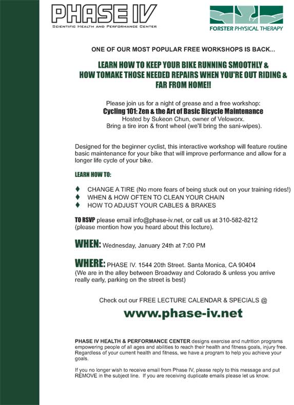 For anyone interested, my tri club sent out a dispatch for a free basic maintenance clinic on Wednesday evening in Santa Monica.