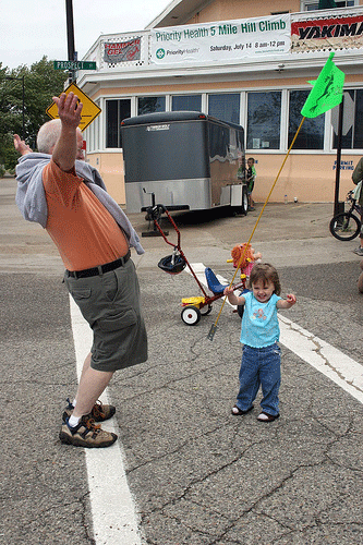 Because I'm a proud mom. Here are some pictures from DD's first bike race, a hill climb. It was the "family event" of the race. DD cannot peddle yet so I pushed her on her trike. There I was, in the rain, running up and down the hill pushing DD--she had a blast. The second lap she got off and pushed the trike by herself. She did a little dance with Papa at the finish line.