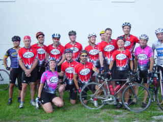 DH rode with the front group. I brought up the rear. It was God-awful, stinkin' hot today. I went through 10 waterbottles of Gatorade, more bananas and PB&J's than I care to think about, and sucked the salt off loads of peanuts. It was HOT! People were cramping left and right (fortunately, I had just a minor cramp 1 mile from the end, and that was it). And the hotter it got, the slower I got. Did I mention it was hot??![]()