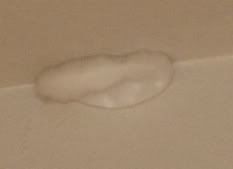 I just found this thing adorning the bathroom ceiling in the house we just moved into (house is less than 4 years old). I can't get someone here with a tall enough ladder until Sunday so in the meantime I'm fretting about all the things it could be. The picture isn't good but the "The Thing" is bright white against an off-white painted wall. It's about 3-4 inches wide. There was some discussion whether the previous owner's grandkids threw wet TP up there but it doesn't look right. A nest of some kind?