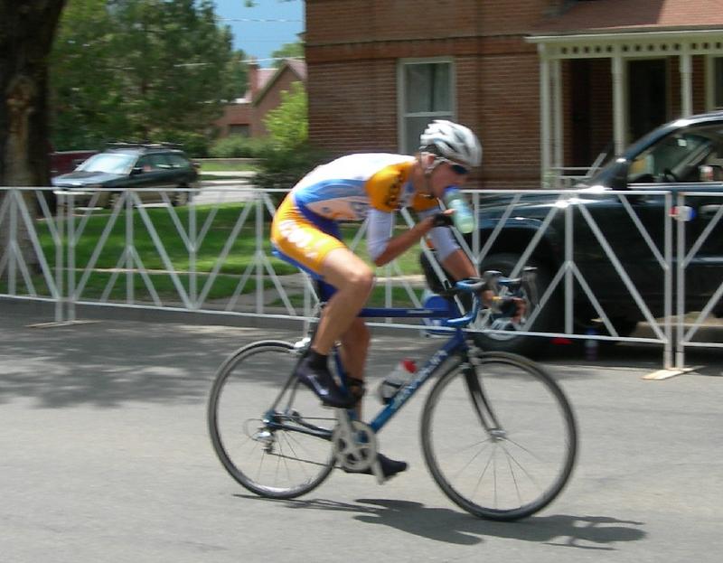 Photo is blurry and out-of-focus. This is Taylor in July 2006, Salida, CO Omnium crit. Dad was across the street (not pictured) doing commentary. Age 15, riding in Cat 4 race....I saw him when.....