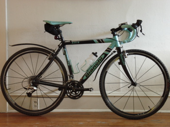This is my old commuter that I rode in NC (she awaits me in the garage - I'll use her again once we buy a house here and my commute is a little longer than it is now). She's a 2004 Terry Classic that I've turned into a 'frankenbike' by adding drop bars and one bar end shifter on the wrong side.She's also got fenders and lights, but I didn't have them on when the photo was taken.