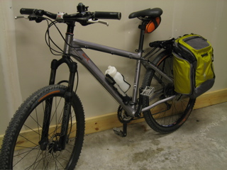 Early 90's rigid Univega MTB frame (21 speed converted to 7 speed when the left shifter broke!), Harris Cyclery trekking bars, 70 deg stem w/delta stem riser, Kenda Kwick Roller Sport (26 x 1.25") tires, Delta Supersherpa Megarack, and the Detours Toocan Pannier