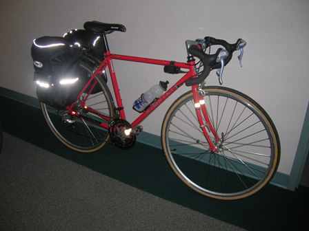 My Jamis Coda Comp with Arkel laptop pannier (and IFJane's schnazzy pink saddle!)