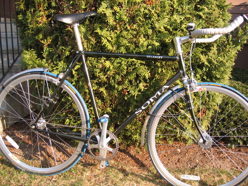 An Ebay-found steel Nishiki, built up with parts from the collection in the basement and a pair of donated 7-speed wheels. The only new parts are the handlebars & tape, tires, lights, and panniers. Everything else came from Ebay or from the stash.