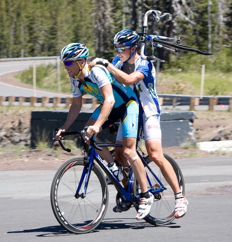 I didn't see it but Chris apparently "rode" another rider into the finish of Mt Bachelor yesterday. Someone crashed and his bike broke so Chris put the guy on the saddle of his own bike with the guy shouldering his broken bike, then stood up and finished the course standing the entire way. A friend of ours up here doing support for SRAM who was taxed to find them on their way to the finish quotes Chris as saying "No, I'm good." as he continued to the finish. I wish I'd seen it. Chris had a huge mechanical on stage 1 and lost time, and essentially has been riding for Levi any way so no worries about his GC. I'm really missing his interviews on Versus during the TdF. He's local so maybe I'll just have to lay in wait for "man on the street" interviews.
