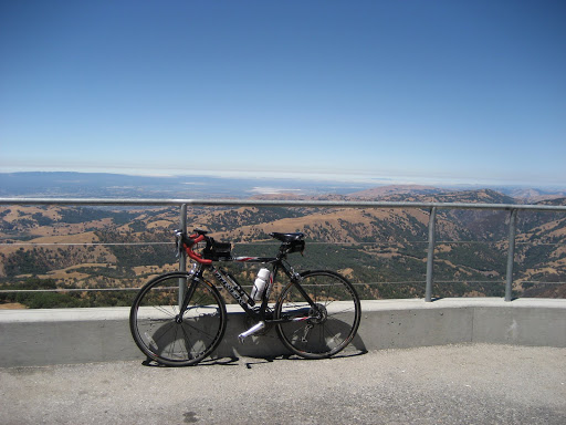 Here's my bike taking a well-earned rest at the top of Mt. Hamilton. There's lots to see up at the top. Since it was a reasonably clear day, I could see Moffett Field's Hangar One (no, not the Vodka!), the Shoreline Amphitheater, downtown San Jose, the lower part of the SF Bay. The Observatory itself is amazing. I went in to top off my Camelbak, and wished I had brought a bike lock so I could have looked around inside longer. Next time!