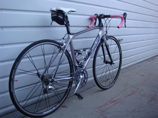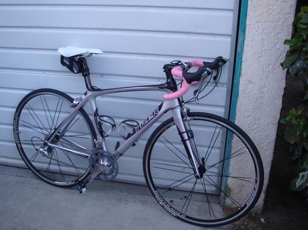 Thanks everybody for helping me accessorize my bike! In the end, I decided to go with a white Specialized Jett saddle, and pink Bontrager cork gel handlebar tape. The saddle has some accents of light pink on it. Call me fashion challenged, but I love it! (Also, I am still waiting for the white handlebar tape to come in).