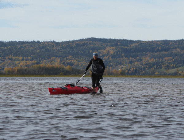 It was a great trip really, no need to complain Not far from where I live two slow rivers run together and into a largish lake, and there are lots of meandering loops and delta islands to paddle in and around. Lots of birds in the spring, now just gaggles of geese practicing for their big departure. We paddled straight out and crossed the first river, turned upstream to get above the largest island, found a really beautiful narrow river "arm" running parallell downstream again, and then got stuck on the silt flats trying to cross back again. The wind had picked up too so we got some choppy waves going back, nothing large at all but it was good to get a little feel for what waves feel like in a not absolutely rock-stable kayak. As long as I used a little power heading into the waves it felt great. I like my kayak