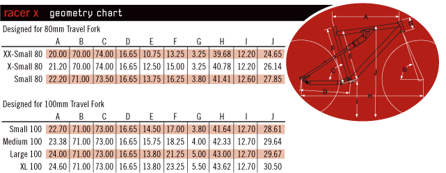 Below are the specs for the geometry from Titus. And correct oakleaf, I purchased the 2005 frame off TE from a nice lady in Hawaii and it was virtually brand new. It was too small for her so she purchased a larger Racer-X frame. 2005 was the last year these frames were hand made in the USA. Mmouwse - the 27+ standover measurement I gave you over the phone was front of center on the top tube. Depending on where the measurement is done along the top tube, will depend on what the "standover" height really is. Hence the difference from the Titus specs below.