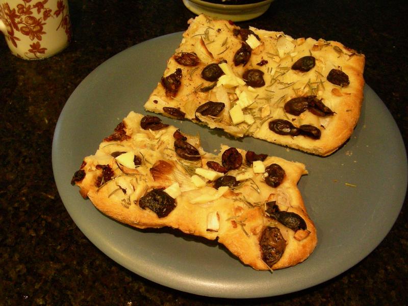 Here's the olive and rosemary pizza/foccacia that I made tonight. The kitchen is usually quite messy whenever I make the dough from scratch. Has onion and garlic also. Part of pan included a section without olives but in lieu of them, with sundried tomatoes. Not in photos.