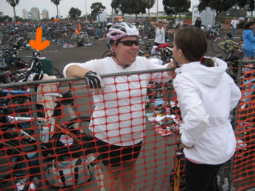 We walked back up to the rack to wait for our swimmer and while we were there, I was trying to text DH to see where they were, but I wasn't getting a signal. I heard "Mom!" and looked up to see them walking toward me, just outside the transition area. (See photo below)