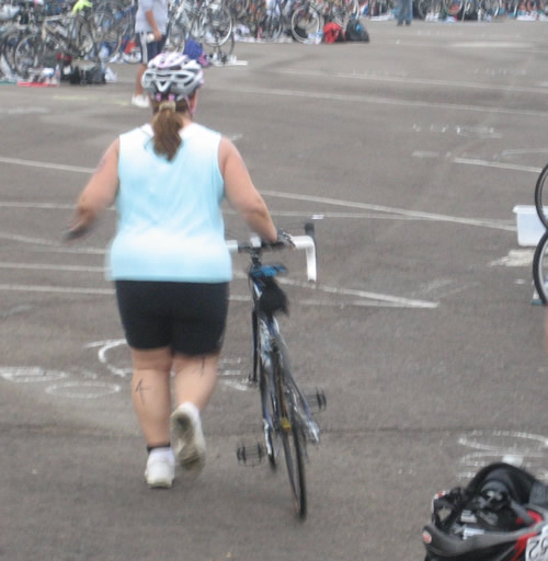 We had our round of good lucks and DH helped me tighten my helmet and took the pictures. Our swimmer finished amazingly fast, we switched the chip from her ankle to mine, and I was off. (see below)