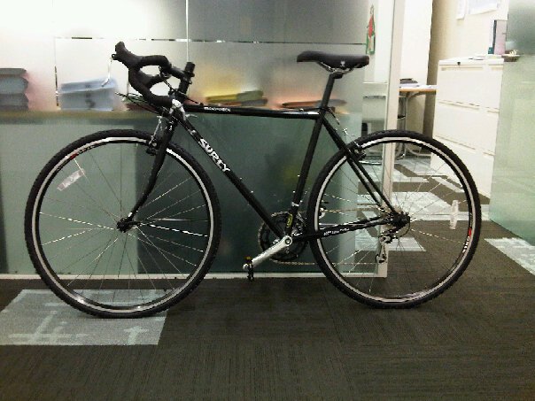 First road bike. Purchased on Cyclescheme (UK). Arrived at my office this morning in a box. A cycling workmate helped me finish the build. Just needs air in the tyres. Oh yes, and lights attached.