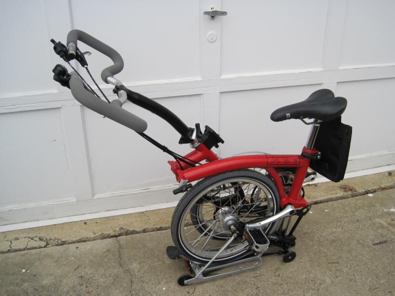 First photo shows how the Brompton can be used as a shopping cart, pulled along by the handlebars. I don't have a bag at the moment, but it would connect to the black carrier block directly across from the saddle nose in this position.