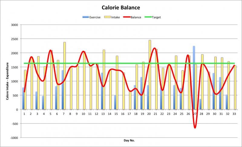 Now I've done some (very geeky, sorry, graph attached) number crunching on my calorie intake over the past month, and am beginning to wonder if I'm not eating enough... Seems ridiculous since I'm trying to lose weight, but looking at the last month's intake & output, my average calorie balance has only been 1200 per day. Looking online tonight, with my exercise level and base metabolic rate it seems like I should be eating closer to 1800-2000 calories per day.