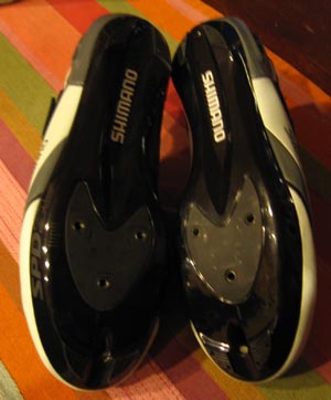 Shimano road shoes that have never been worn outdoors. In fact, I wore them for only about 5 minutes on a trainer before I figured out that I don't like clipless road pedals. There is some slight scuffing on the bottoms from trying to get the hang of clipping in. I think I managed to do it once & then I couldn't get out!I'm a Speedplay Frog girl now so the Shimanos need to find a forever home
