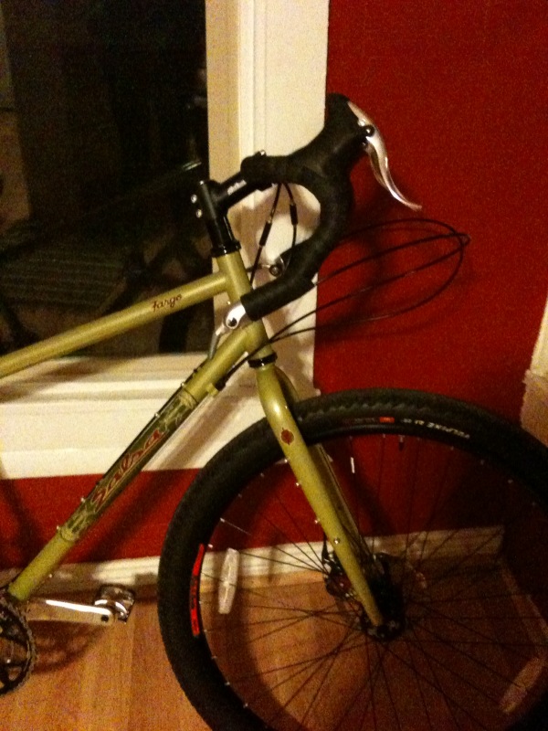 Becky, here's a photo. I don't have anyone to take a photo of me riding (the cats aren't that skilled) and the light is terrible so the focus isn't so great b/c I took it with the phone. But it should give some idea: