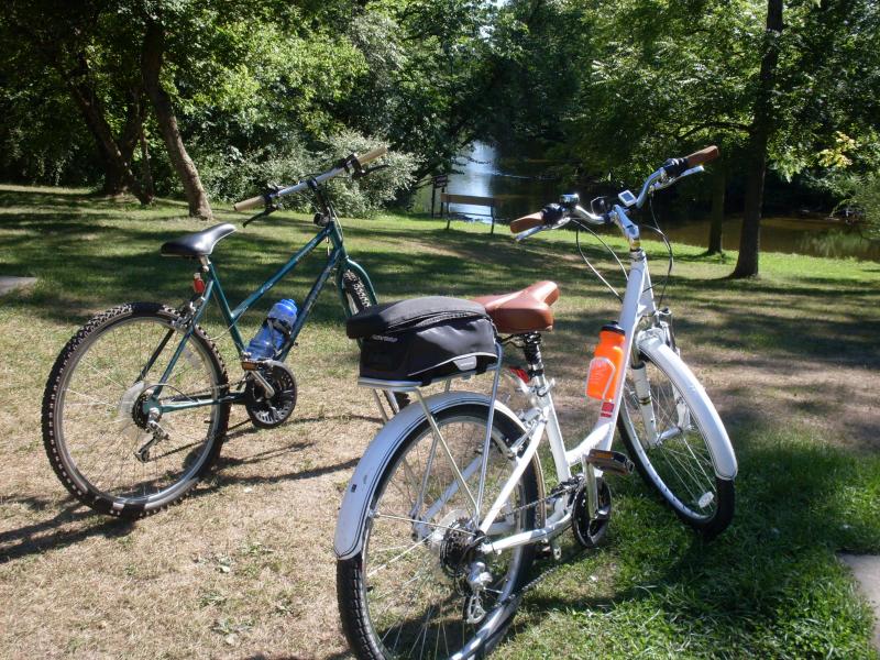 I dug up a few. The pair of bikes is from a ride last week with my niece at Island Lake State Park with a stop riverside. The quaint little shop is a food co-op where I stopped for a snack in downtown Ypsilanti on the Washtenaw County Border to Border tail and the view from the bridge is in the same town overlooking Riverside Park and the Huron River.