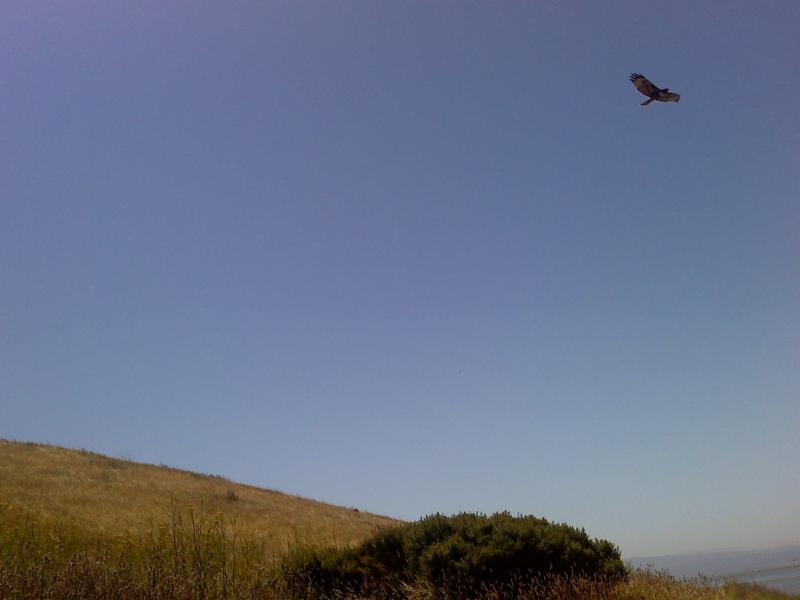 I often ride around Coyote Hills park near my home. One day, I went around a curve and came face to face (beak to beak?) with a big beautiful hawk perched on a bush. He took off and cruised overhead for a while; this was the best picture I could get on my cell phone camera. It was a lovely sight.