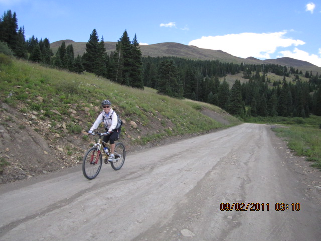 Yesterday we did our annual ride up Boreas Pass outside of Breckenridge, Co. The road is an old RR bed, with a hard packed, dirt surface. Cars are allowed on the road but the tourists had not yet arrived so we had the road pretty much to ourselves. Temps were in the mid 60's. We started at approximately 10,000 ft and rode to the top, 11,481 ft. The climb was 3-4% for 6 miles. It took about an hour to reach the top. On the ride down we had beautiful views of Aspen forests and the Breckenridge Ski area. There is still snow at the top of the mountain!