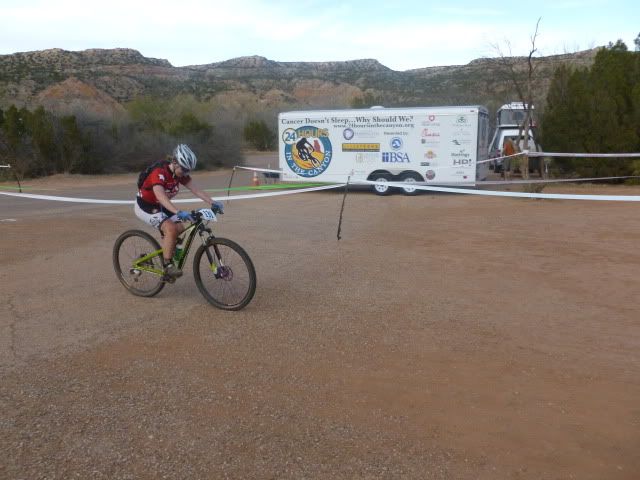 I heard Melinda cheering, it is always nice to hear your name and get a little pick me up to keep going. The first lap was right at two hours and that lap was slightly longer than the others would be. At the first pit I tried not to make the mistake I made last year, I didn't pause long enough to think about what I needed last year and really missed the nutrition. I topped off my Camelback and was happy I drank quite a bit in lap one, I also needed almost a whole bottle of Gatorade. I grabbed some extra gels and ate part of a peanut butter sandwich, then I was off. Lap two I really noticed the headwind that seemed to dominate the trail after mile two. At some points I felt like I was barely moving, I kept telling myself to push I had to keep the lap under two hours to make the time cut. Most of the lap was uneventful until we got to the Lighthouse Climb and Red Star area, that is when I started to get lapped by the fast guys. A few times the trail was so tight I just hopped off, these guys were going for a huge purse. It was cool that they were all super nice. At this point I got passed by the other women I knew was in my age group, this was a little disappointing because I thought she was lapping me. I was having some tightness in my legs, not full blown cramps but not a good feeling either at this point I took on my second Gu of the lap. Once I got to the drop into the Prairie Dog fork I knew we were out of the technical area and into the part I could just have fun with, I looked down and knew I should be okay on the time cut off. I caught back up to the girl in my division, she kept walking climbs. One I didn't make I asked if she was on the last lap, she said no her second and suddenly it was game on. My lap was slightly under two hours again.