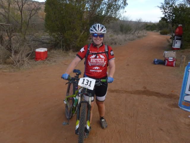 At the pit I noticed my competitor hardly took on anything. I still grabbed extra Gatorade, water and took Sport Legs. I should have taken on an extra Gu. I caught my competition, she was walking a tough climb I couldn't make either. She got back on and disappeared, I didn't panic and knew if I was going to finish this lap I had to ride my ride. About a mile later I cleaned a climb my competitor was walking. I took off and saw she was getting back on, then I pulled away. At this point I decided I had to keep from bonking, if I got off the bike I would make sure to grab Gatorade. I kept just watching for things I remembered, Red's Rock, the beefy climb, the Lighthouse Parking lot. I got to the parking lot and saw three people at the trail head, one woman and her husband who passed me early on. The third rider asked me my number, I thought they were cutting time but he said no he was sweeping. I had new resolve when I heard that, still no clue where the girl had gone but I knew I had about an hour of riding to get to glory. My legs got tight off and on most of the lap, I would put it in a gear I could spin in more, rub the muscles and just try to keep moving. I was so happy to drop the nasty gravel climb to Prairie Dog about 40 minutes later, it was a little creepy the course marshalls were gone but I knew Chris knew I was still out. I just kept riding along, sometimes smiling just to perk myself up.