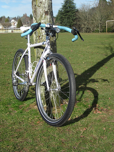 Only did a couple errand rides, but I got to do them on my latest experiment (using my MB-5). Midge bars and Schwalbe Big Apples (26x2.15). What fun! Windy yesterday and today, but beautifully sunny.