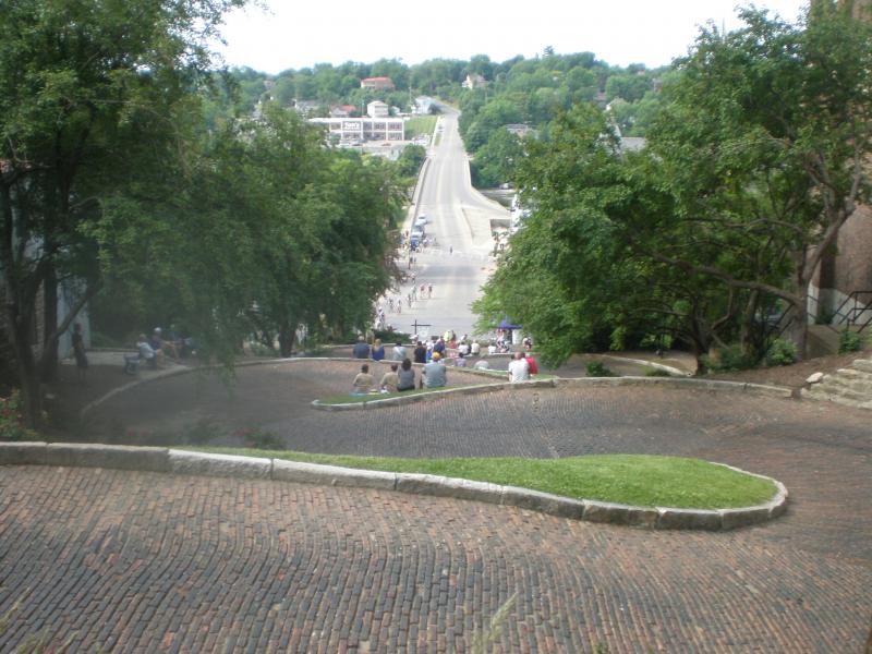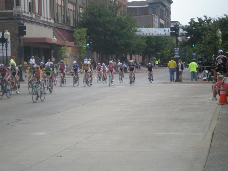 looking down from the top of snake alley- the tiny dots waaaay down there are riders on the preclimb (the grey rectangular marks on the blacktop)