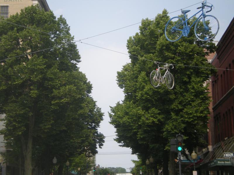 downtown race decorations, bikes, bits and pieces of bikes etc at each major intersection