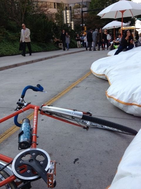 The street was closed to traffic, and the city put giant bean-bags in the middle of the road to sit on.